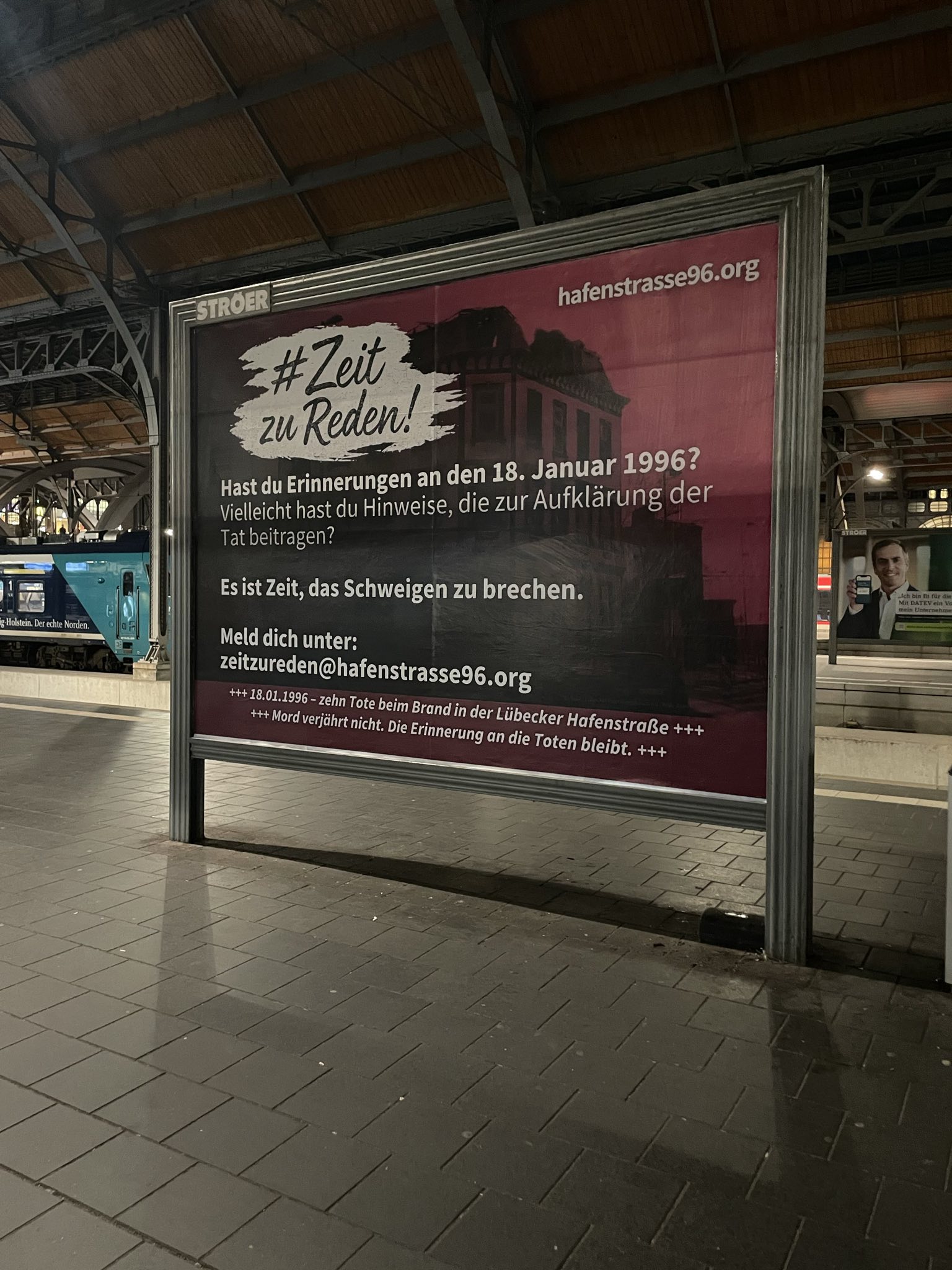 Lübeck, 16. Dezember 2025 – Heute startet die Initiative Hafenstraße 96 die norddeutschlandweite Kampagne #zeitzureden. Ziel der Kampagne ist es, zur Aufklärung des Brandanschlags in der Lübecker Hafenstraße 52 vom 18. Januar 1996 beizutragen – dem bis heute tödlichsten Brandanschlag in der Geschichte der Bundesrepublik Deutschland.